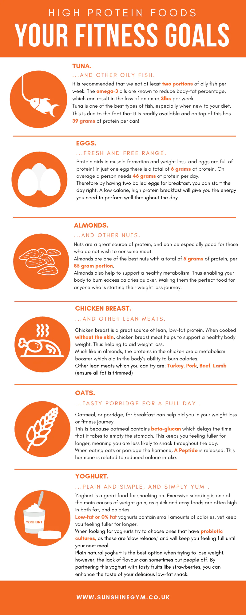 At Sunshine Gym we love to encourage a healthy lifestyle, and provide information to support you no matter what stage in the fitness journey you are at. That is why below we have come up with a visual list of different HIGH PROTEIN foods which should be eaten regularly.