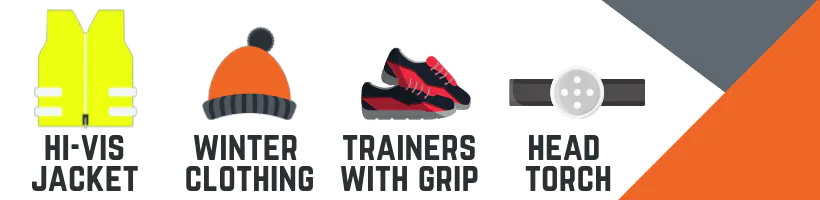 - Ensure you are wearing the correct attire – Including safety gear such as a Hi-Vis or a headlamp.